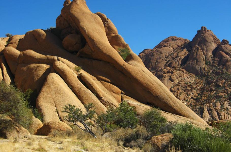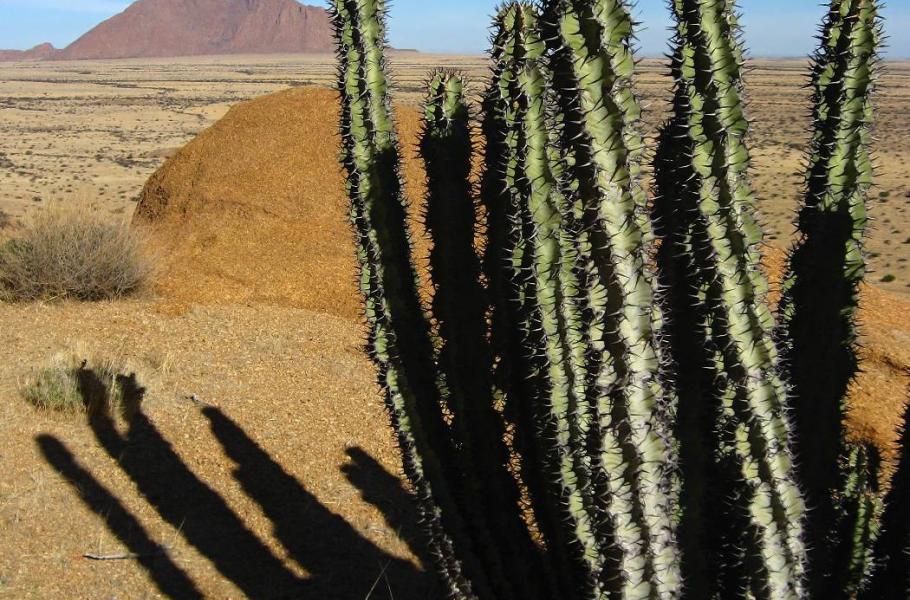 Populární okružní trasa kolem celého solitéru Spitzkoppe byla v době naší návštěvy bohužel zavřená. Zasloužili se o to paradoxně američtí filmaři, kteří uzavřeli celou severní stranu masívu pro natáčení megalomanského hollywoodského blábolu režiséra Emmericha – 10 000 let př. n. l. Vysoký plot, který má uvnitř udržet divoká zvířata, má stále svou platnost, a tak se musíme spokojit se skromnější variantou. Velmi lákavý je především obrovský skalní blok, který leží přímo naproti nejvyššímu vrcholu. Podle našeho odhadu je nejen schůdný, ale jistě nám nabídne i nevšední výhledy do krajiny. Po skalní stěně se navzdory značnému sklonu dá celkem bez problému chodit (díky drsnému povrchu), a tak velmi rychle nabíráme výšku. Překvapivým objevem je nádherný exemplář sukulentu Cyphostemma currori z čeledi révovitých (Vitaceane). Jsme dost zaraženi skutečností, že rostlina zde vyrůstá takřka z ničeho – s kořeny zapuštěnými do tvrdé skály. I když je pravda, že tento sukulent vystačí s minimem vody a na slunci se mu evidentně líbí. Námi objevený exemplář má výšku dobré čtyři metry, což není maximum. Rekordní zaznamenaný vzrůst je kolem sedmi metrů a obvod kmene může dosáhnout 1,8 metru!