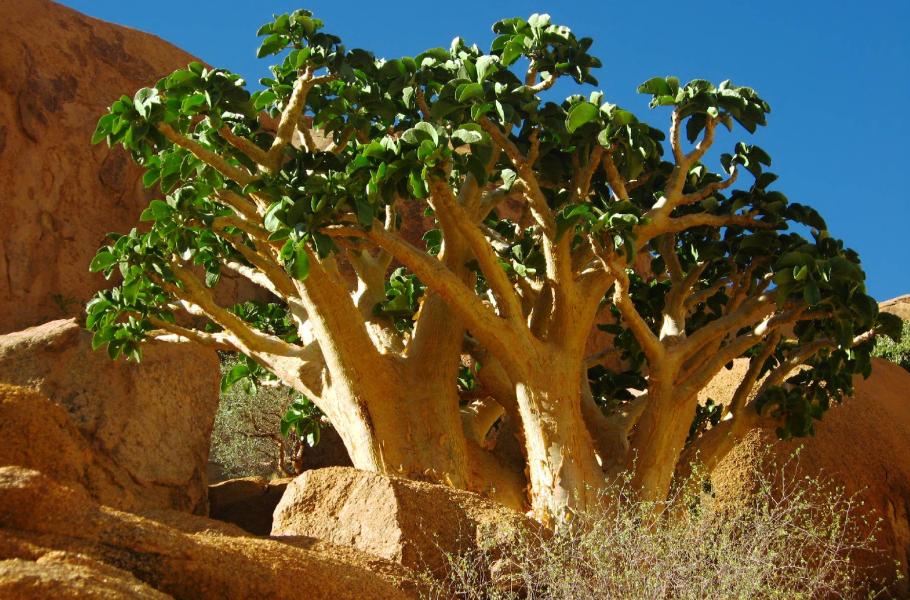 V pásu zeleně mezi skalními bloky lze spatřit nádherné exempláře stále zeleného keře Tapinathus oleifelius s nápadnými květy, které tvarem a barvou připomínají fosforové zápalky. V suché oblasti Damaralandu má tato rostlina svůj nezanedbatelný význam, protože kvete v zimě a poskytuje tak nektar pro hmyz. Dále zde můžete narazit na stromy shea (Vitellaria paradoxa) z jejichž ořechů se vyrábí populární „bambucké máslo“. Tento krémový tuk je využívaný již po staletí především v kosmetice a tváře si s ním prý potírala už královna Kleopatra. Jeho využití v Africe je však mnohem širší – používá se jako náhrada za kakaové máslo při výrobě čokolády, vyrábí se z něj tradiční stolní olej nebo vosk na svíčky. Zvláště pozoruhodné je jeho použití při výrobě afrických bicích nástrojů, u nichž zvyšuje odolnost dřeva.