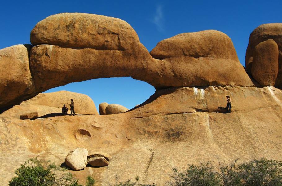 Prvním cílem našich průzkumných cest je pověstný skalní oblouk, který patří vedle samotného Spitzkoppe k největším zázrakům přírodního parku. Sice vůbec netušíme, kde se útvar nalézá, ale říkáme si, že areál nakonec není tak rozlehlý, aby se před námi skalní most dokázal schovat. Nakonec ale bylo jeho objevení spíše dílem náhody, protože oblouk leží v dost zastrčené západní části skalního města a jeho fantaskní tvar není odnikud viditelný.