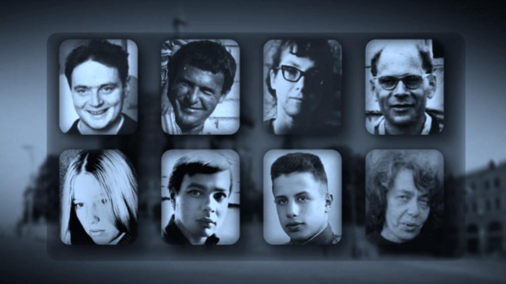 Osm statečných z Rudého náměstí (nahoře zleva): Litvinov, Dremljuga, Gorbaněvská, Babickij. Dole zleva: Bajevová, Delone, Fajnberg, Bogorazová. (foto: ČT24)
